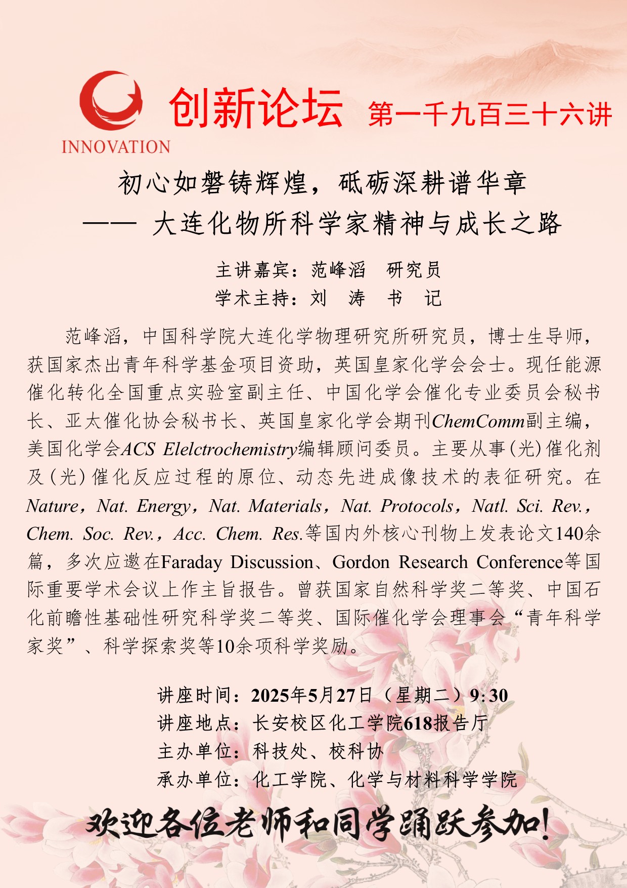范峰滔 研究员 星空线上平台(集团)官方网站创新论坛第一千九百三十六讲:初心如磐铸辉煌,砥砺深耕谱华章——大连化物所科学家精神与成长之路 讲座时间 2025年5月27日(星期二)9:30 讲座地点 长安校区化工学院618报告厅 讲座人介绍 范峰滔 研究员 讲座内容